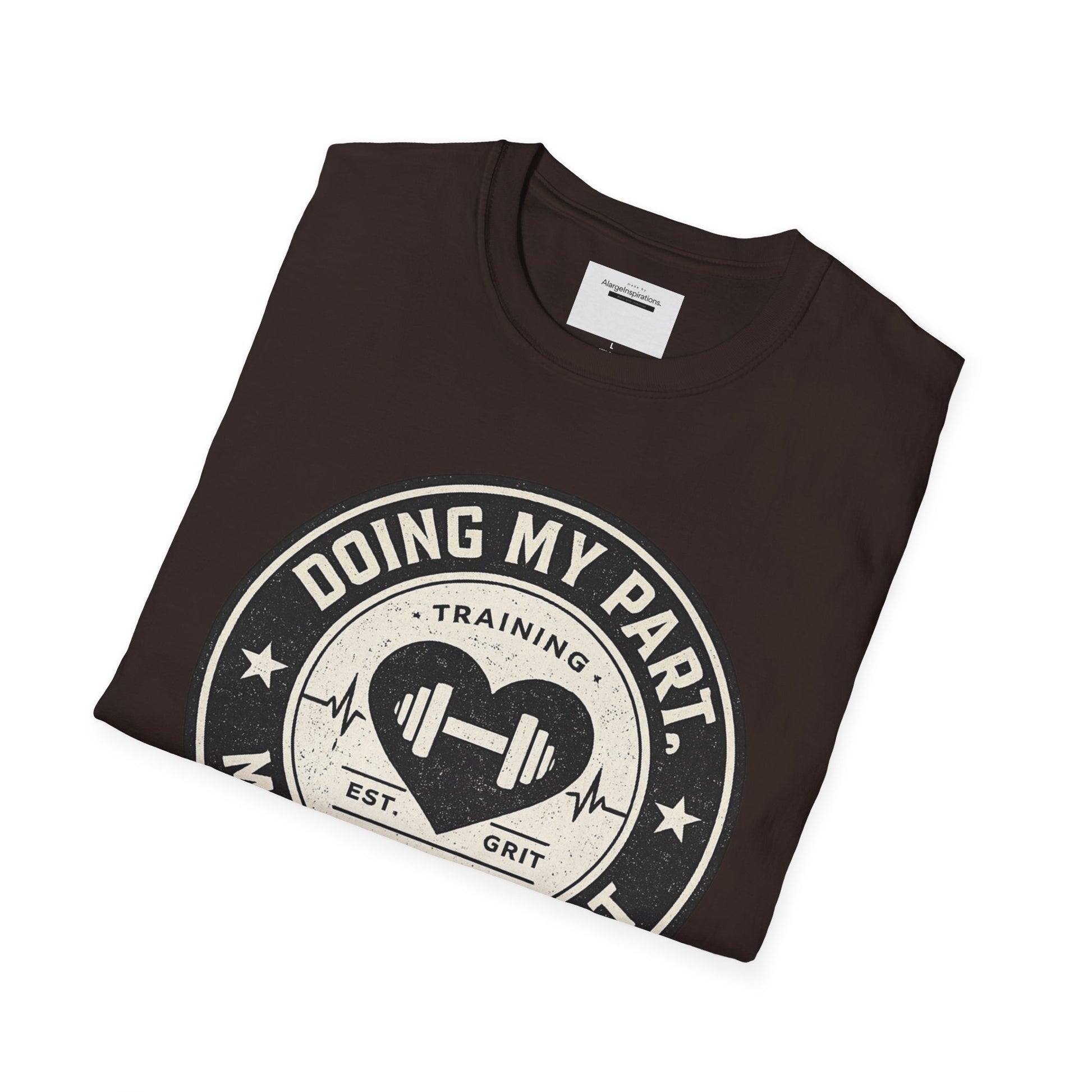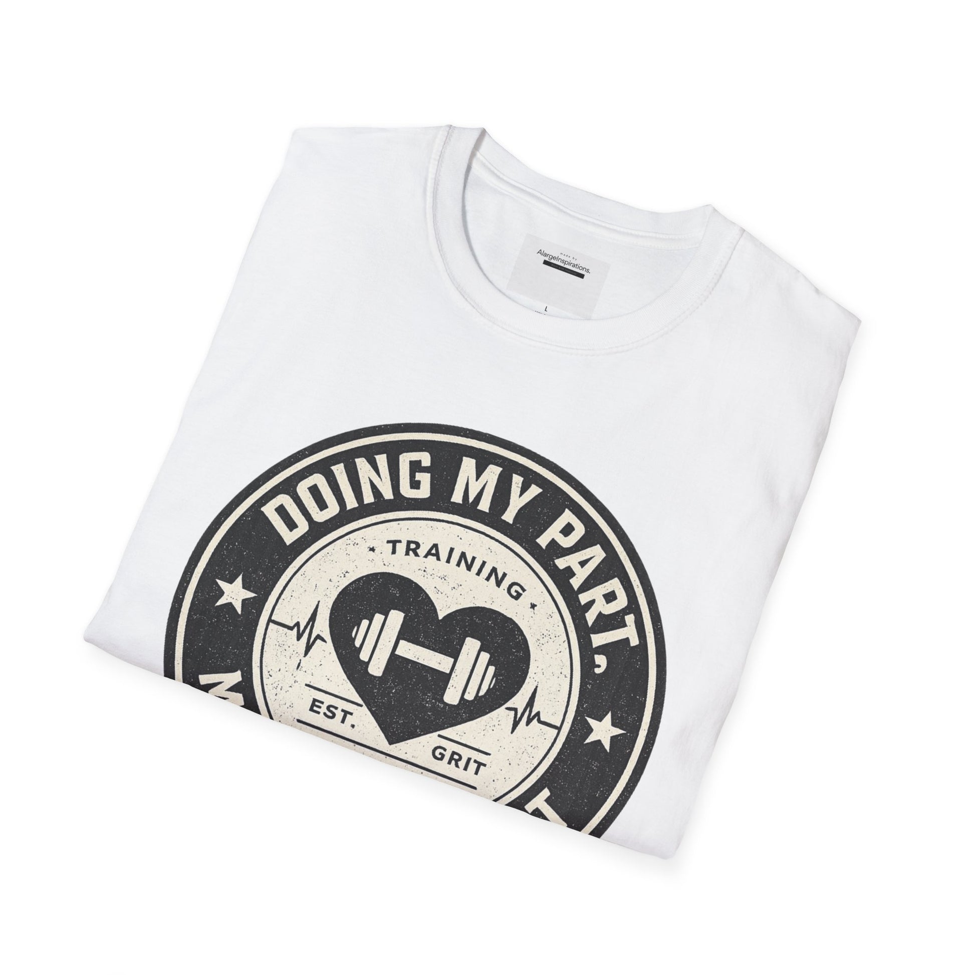 At AlargeInspirations, we celebrate effort, grit, and heart. The “Doing my part, mostly by heart.” t-shirt features a vintage-inspired fitness badge designed for those who show up, put in the work, and train with purpose. With bold athletic typography and a classic emblem-style layout, this design captures discipline, endurance, and heart-driven effort. Whether you’re lifting, running, coaching, or grinding through a workout, this shirt speaks for you—without saying too much.